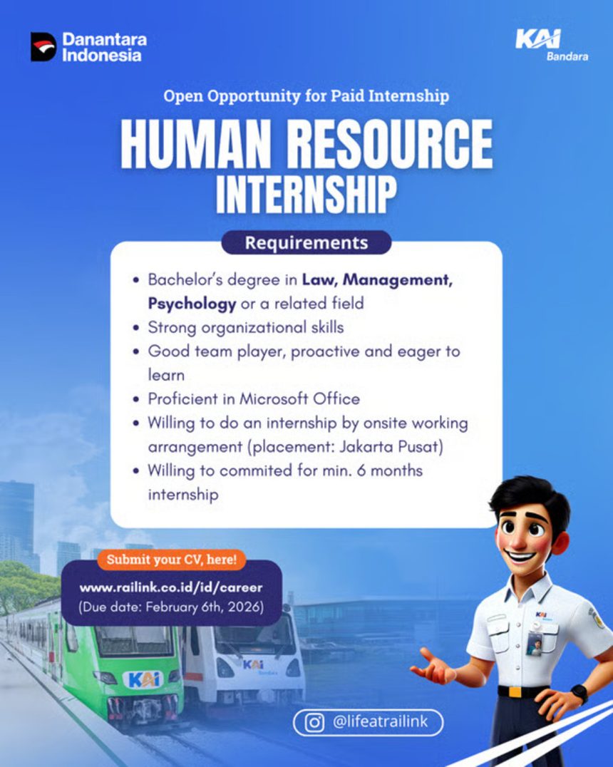 Pendaftaran program magang ini dibuka hingga 6 Februari 2026 dan dapat diakses melalui tautan resmi rekrutmen perusahaan www.railink.co.id